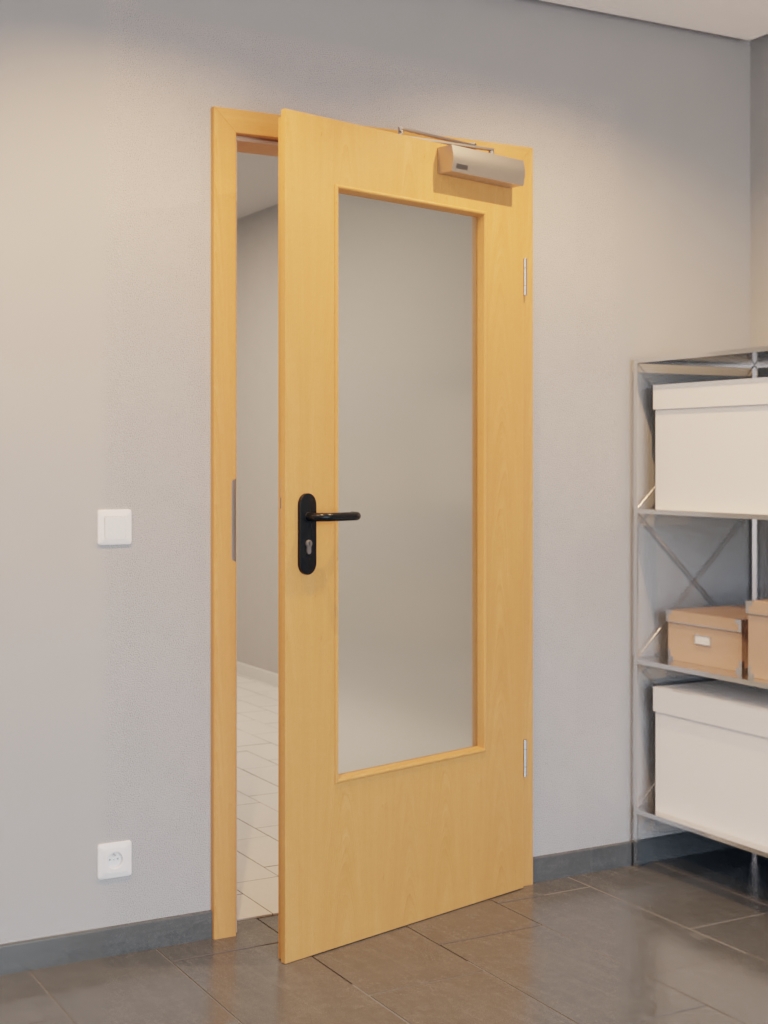 Konstrukcja składa się z ramy z litego drewna ze stabilizatorem, płyty wiórowej oraz 3 mm grubej, wysokodensyfikowanej płyty HDF jako pokrycia. Zgodnie z normą DIN 18095 dla drzwi przeciwpożarowych, drzwi są wyposażone w górny zamykacz drzwi oraz opuszczaną uszczelkę podłogową.