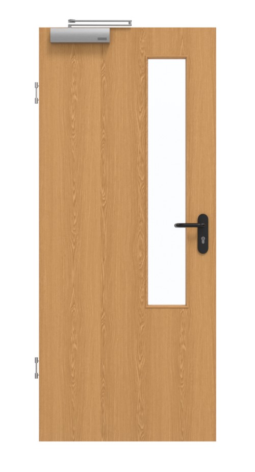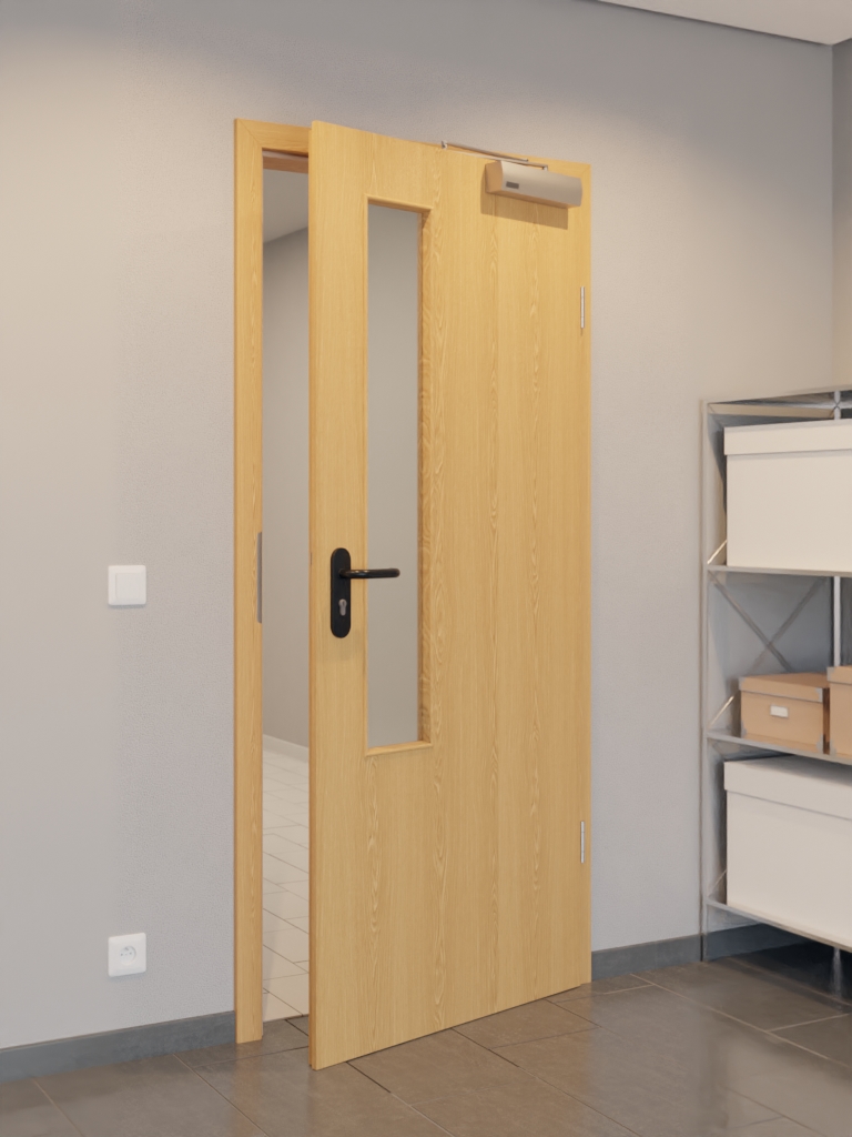 Rama z litego drewna ze stabilizatorem tworzy stabilną konstrukcję z płyty wiórowej pełnej i warstwy z HDF. Zgodnie z normą DIN 18095 dla drzwi przeciwpożarowych, drzwi są uzupełnione o górny mechanizm zamykający oraz opadającą uszczelkę podłogową.