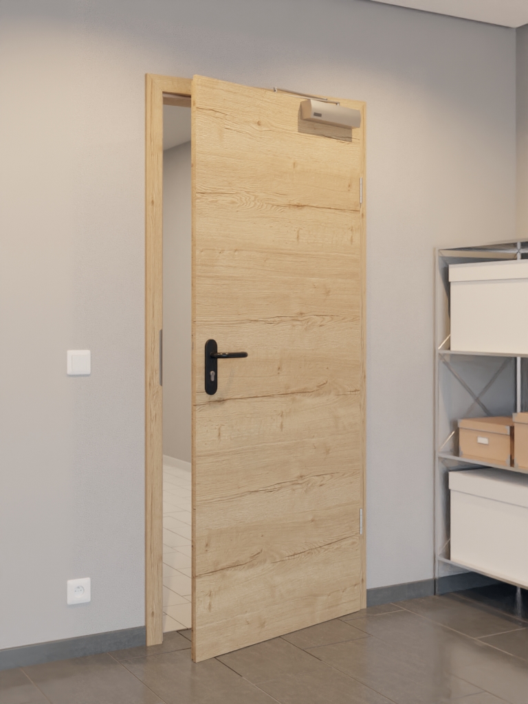 Stabilność wewnętrzną zapewnia konstrukcja z ramą z litego drewna z stabilizatorem oraz płytą pełno-włóknistą. Na wierzchu zastosowano 3 mm grubą, wysokodensywną płytę włóknistą. Wraz z zamkiem górnym i opadającą uszczelką podłogową drzwi spełniają normę DIN 18095 dla drzwi przeciwpożarowych.