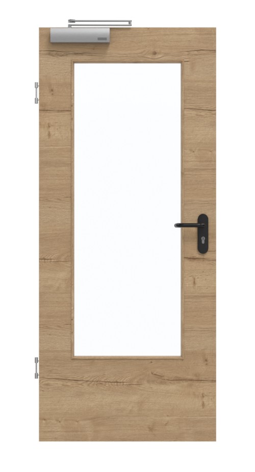 Skrzydło drzwiowe, zawiasy, zamek cylindryczny, przeszklenie, samozamykacz, obniżana uszczelka podłogowa, czarny plastikowy uchwyt.