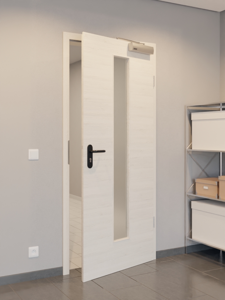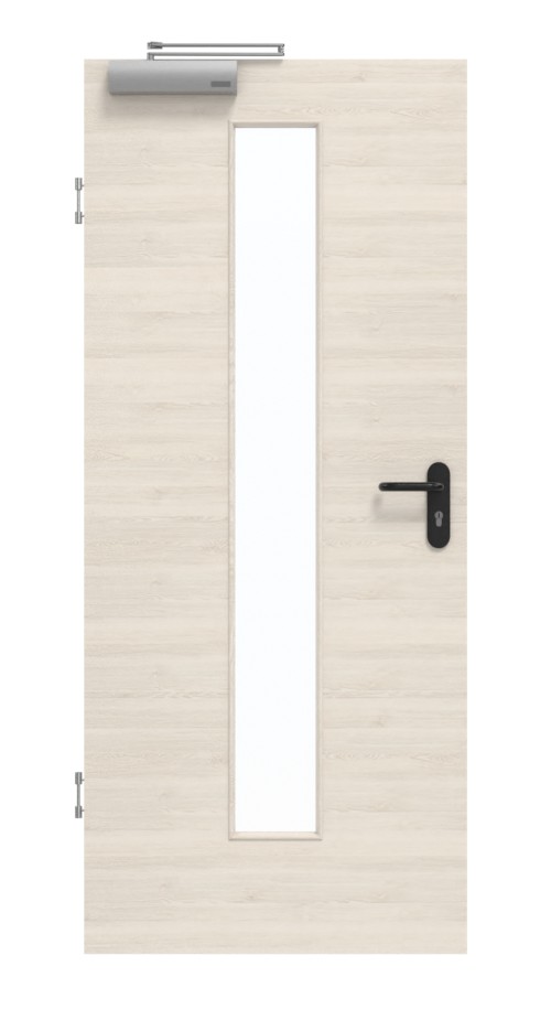 Skrzydło drzwiowe, zawiasy, zamek cylindryczny, przeszklenie, samozamykacz, obniżana uszczelka podłogowa, czarny plastikowy uchwyt.