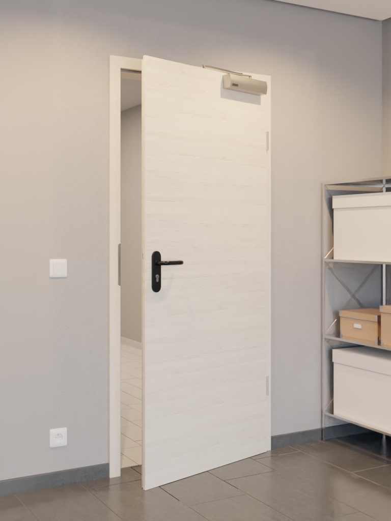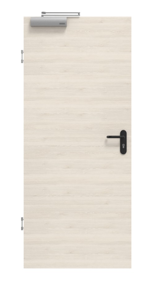 Wnętrze drzwi tworzy rama z litego drewna ze stabilizatorem oraz płyta wiórowa pełna. Konstrukcję wieńczy zaokrąglona warstwa wierzchnia z płyty HDF o grubości 3 mm. Zgodnie z normą DIN 18095 dotyczącą drzwi dymoszczelnych, kompletny zestaw uzupełnia samozamykacz drzwiowy górny i opuszczana uszczelka podłogowa.