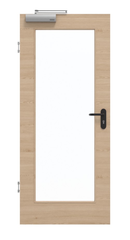 W pomieszczeniu wewnętrznym drzwi znajduje się solidna płyta wiórowa pełna w ramie z litego drewna ze stabilizatorem. Warstwa wierzchnia składa się z płyty HDF o grubości 3 mm. Zgodnie z normą DIN 18095 model jest uzupełniony o samozamykacz drzwiowy górny oraz opuszczaną uszczelkę podłogową.