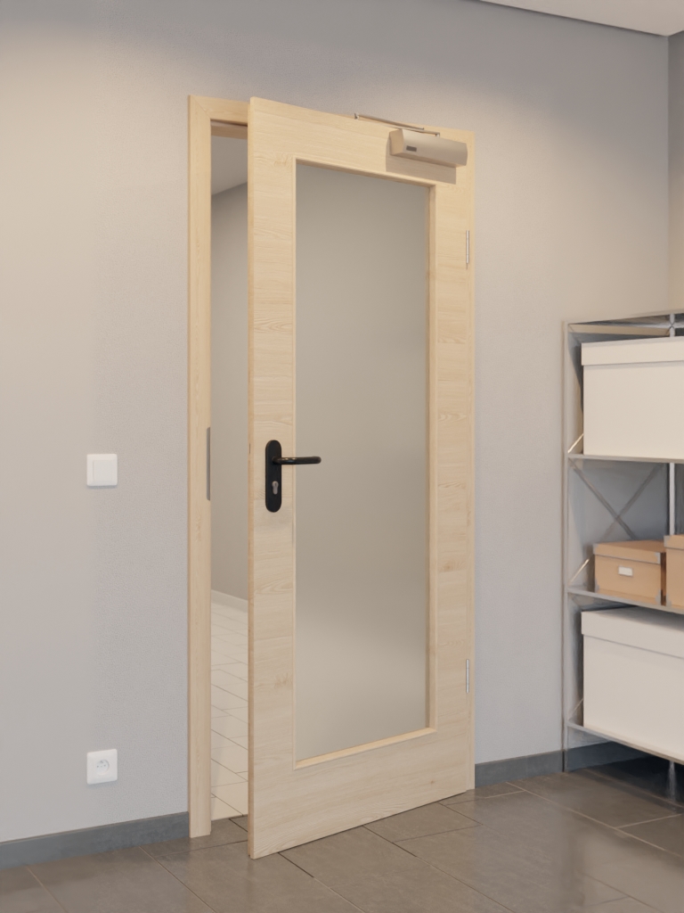 Oprócz skrzydła drzwiowego standardowy zakres dostawy obejmuje plastikową klamkę, zamek PZ, dwa trzyczęściowe zawiasy, nożycowy zamykacz górny oraz opuszczaną uszczelkę podłogową.
