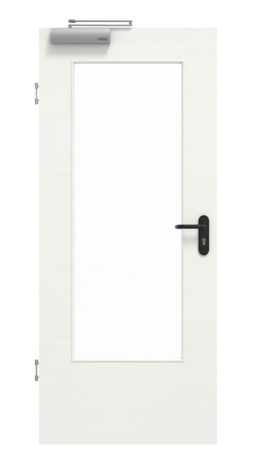 Skrzydło drzwiowe, zawiasy, zamek cylindryczny, przeszklenie, samozamykacz, obniżana uszczelka podłogowa, czarny plastikowy uchwyt.