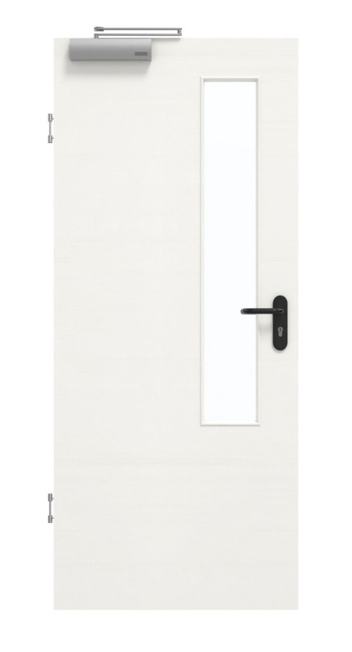 Skrzydło drzwiowe, zawiasy, zamek cylindryczny, przeszklenie, samozamykacz, obniżana uszczelka podłogowa, czarny plastikowy uchwyt.