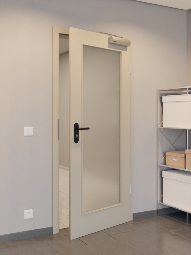 W środku drzwi znajduje się solidna płyta wiórowa oraz rama z litego drewna ze stabilizatorem. Warstwa wierzchnia składa się z płyty HDF o grubości 3 mm. Zgodnie z normą DIN 18095 dotyczącą zamknięć przeciwdymowych model ten uzupełnia zamknięcie drzwiowe oraz opuszczana uszczelka podłogowa .