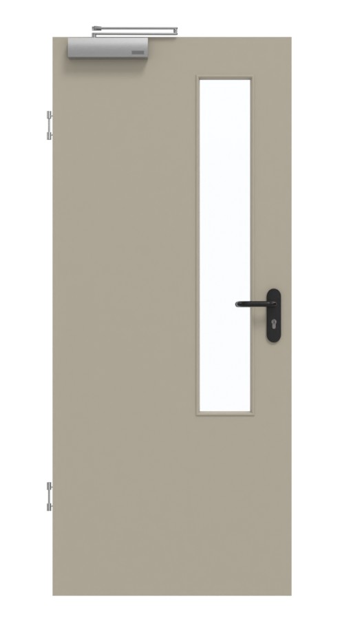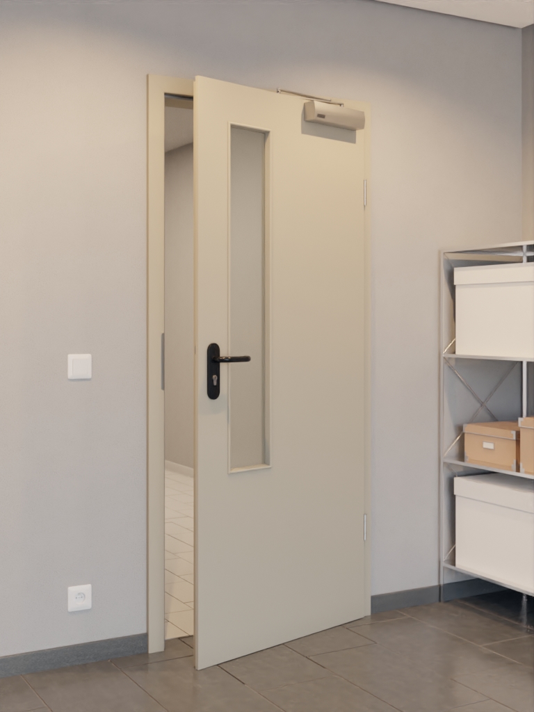 Solidna wkładka z płyty wiórowej, rama z litego drewna ze stabilizatorem oraz płyta wierzchnia z HDF stanowią podstawę tego modelu. Zgodnie z wymaganiami normy DIN 18095 dotyczącej drzwi przeciwpożarowych drzwi są wyposażone w zamknięcie górne oraz opuszczaną uszczelkę podłogową .
