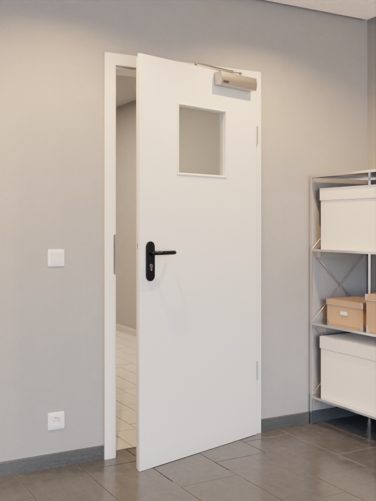 Konstrukcja składa się z solidnej ramy z litego drewna ze stabilizatorem, płyty wiórowej o pełnej gęstości oraz płyty HDF o grubości 3 mm i wysokiej gęstości, stanowiącej warstwę wierzchnią. Zgodnie z wymaganiami normy DIN 18095 dotyczącej drzwi przeciwdymowych, drzwi są wyposażone w zamknięcie górne oraz opuszczaną uszczelkę podłogową .