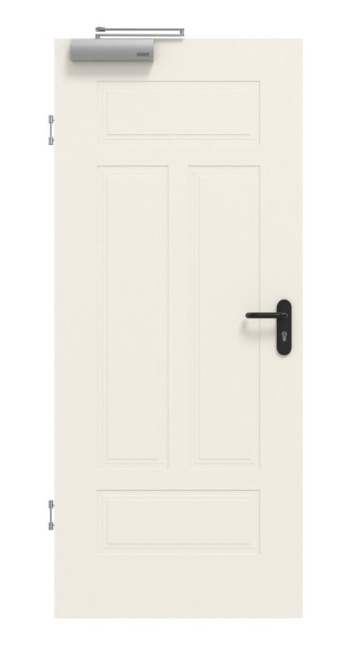Solidne drzwi przeciwpożarowe w klasycznej bieli z opadającą uszczelką podłogową: