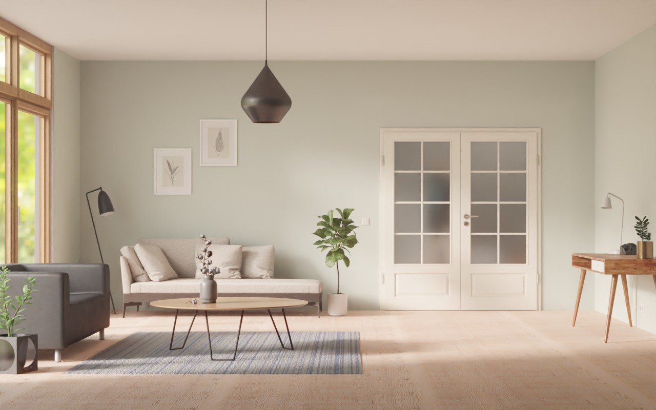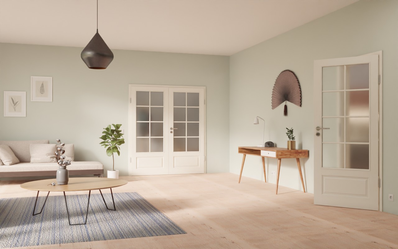 Delikatne ramki z przegrodami dzielą duże przeszklenia wizualnie na osiem pól. W dolnej części drzwi wytłoczone wypełnienia uzupełniają klasyczny design. Matowa biała farba w opcjach RAL 9010 lub RAL 9016 jest przyjazna dla środowiska i odporna na zarysowania oraz ścieranie.