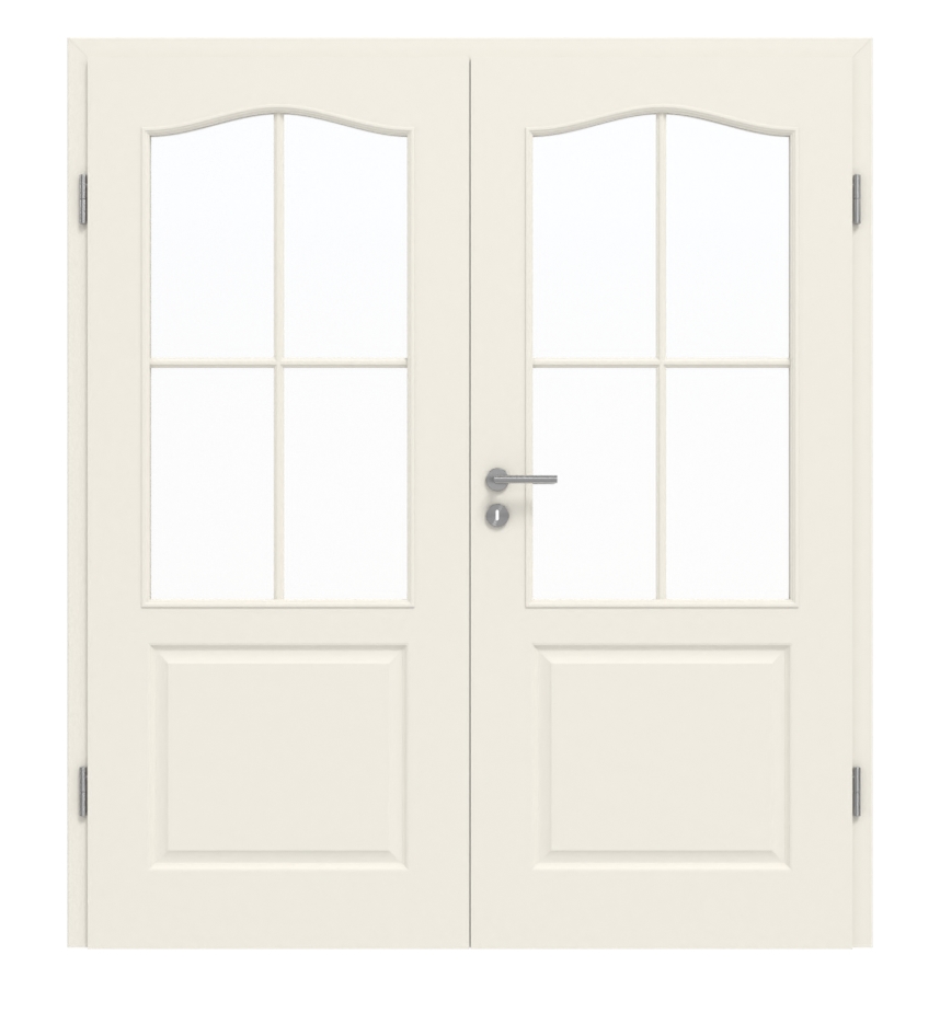 Oba duże, delikatnie wygięte ku górze szkła zdobią subtelne ramki z przęsłami. Pod otworami świetlnymi znajduje się wyprofilowana prostokątna wypełnienie. Klasyczny wygląd podkreśla matowy lakier w kolorze białym, dostępny w wariantach RAL 9010 i RAL 9016. Jest utwardzany UV i nakładany w ekologiczny sposób w kilku równomiernych warstwach. Dzięki temu uzyskuje się łatwą w pielęgnacji oraz odporną na ścieranie powierzchnię o przyjemnej fakturze.