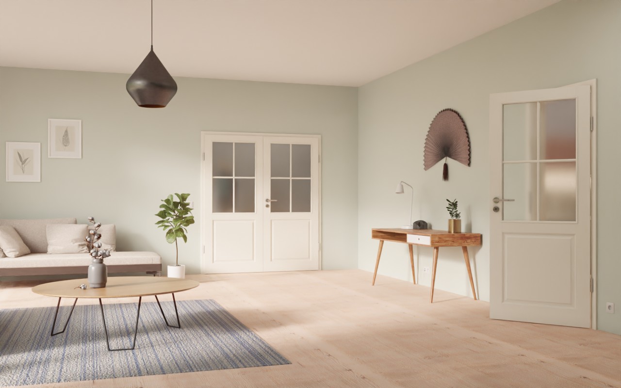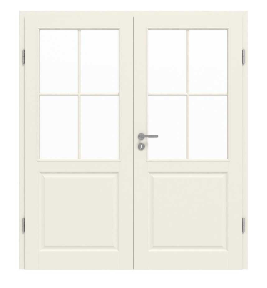 Stabilne podwójne drzwi wewnętrzne w matowej białej lakierze, w tym ościeżnica, zawiasy i zamek: