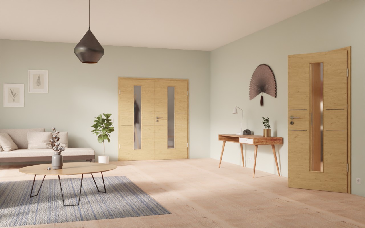 W środkowej części skrzydeł drzwi znajduje się smukłe wycięcie na szybę, otoczone obustronnie delikatnymi lizenami. Dekor Quer Authentic dąb szypułkowy tworzy realistyczny wygląd drewna. Warstwa wierzchnia CPL jest wyjątkowo odporna na zarysowania, uderzenia i ścieranie. Ponadto jest odporna na zabrudzenia i zwykłe domowe środki czyszczące.