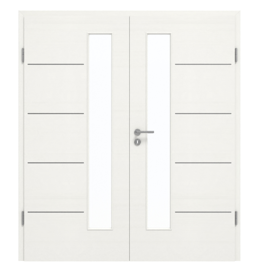 Wąskie szklane wstawki i harmonijnie rozmieszczone lizeny nadają tym designerskim drzwiom nowoczesny wygląd. Wzdłuż nowoczesnego, białego dekoru Authentic Bianco rozciąga się autentyczne i nowoczesne usłojenie drewna. Powierzchnia CPL jest odporna na zarysowania, uderzenia i ścieranie. Ponadto łatwo ją wyczyścić.