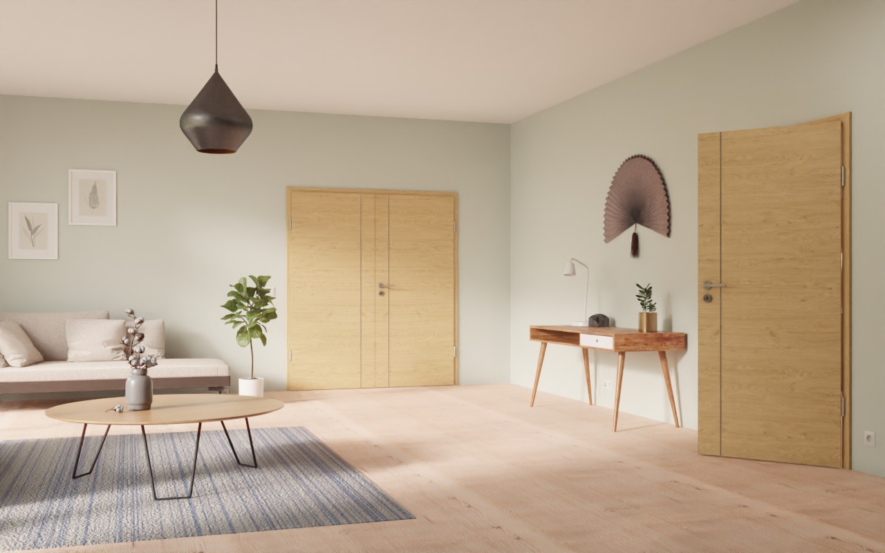 Nowoczesne drzwi wewnętrzne podwójne zachwycają odporną na brud powłoką CPL oraz rdzeniem z płyty wiórowej: