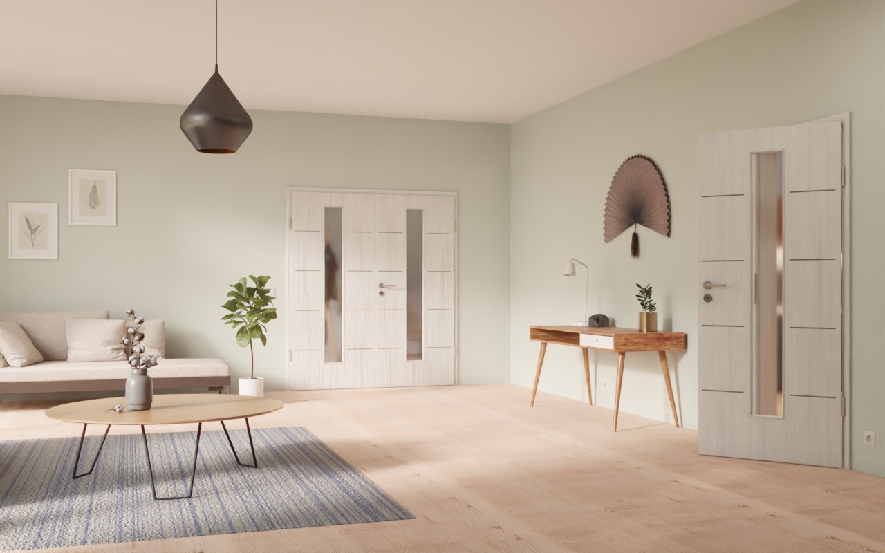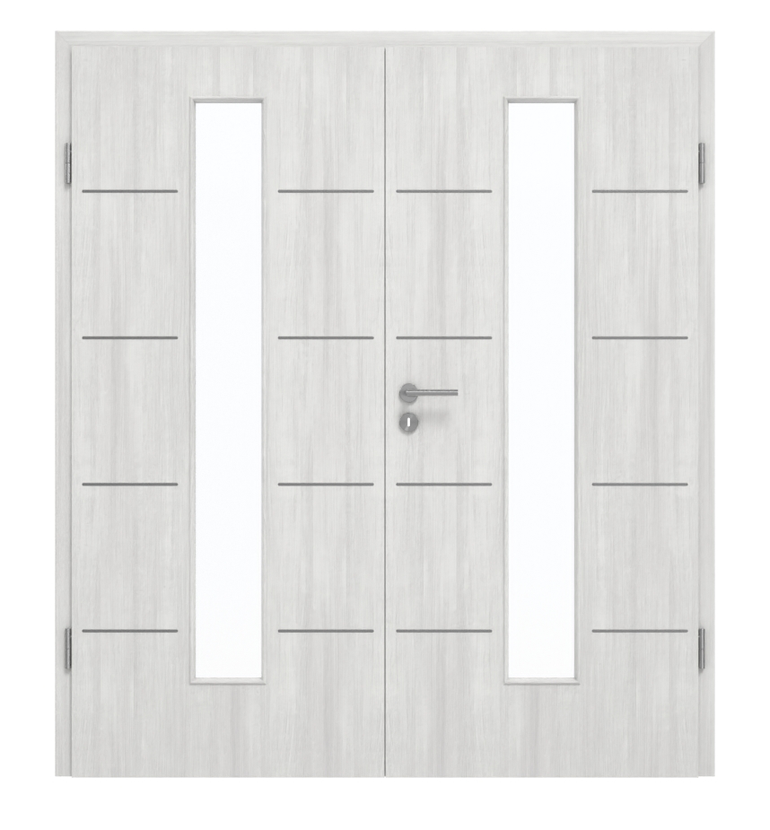 Designowa podwójna drzwi wewnętrzne wyróżniają się odporną na brud powłoką CPL oraz rdzeniem z pełnego wióru: