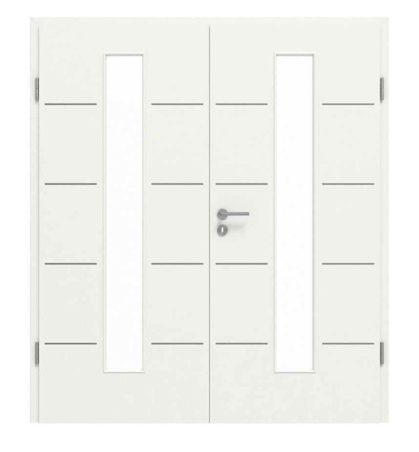 Atrakcyjne drzwi podwójne prezentują się z łatwą w pielęgnacji powłoką CPL i wąskimi przeszkleniami: