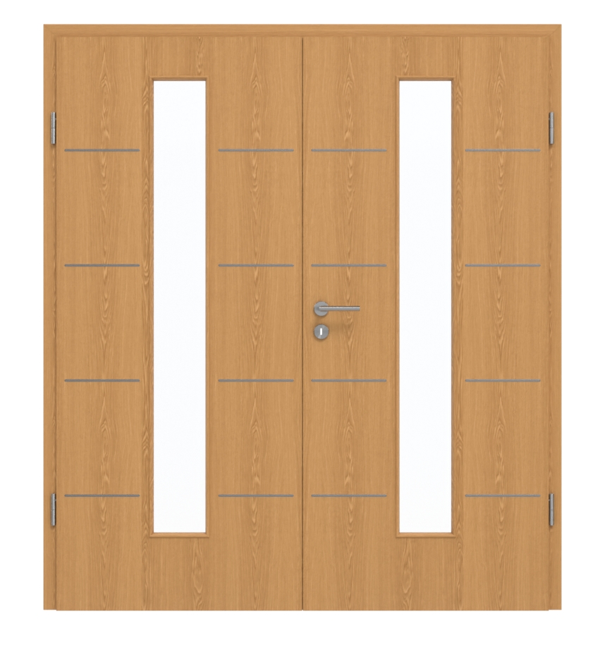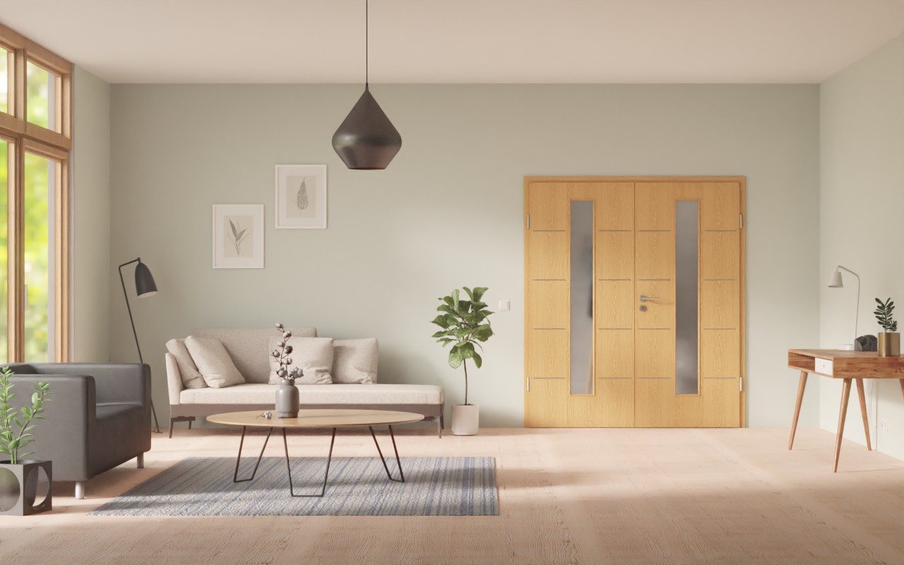 Drzwi wewnętrzne z podwójnymi skrzydłami zachwycają trwałą powierzchnią CPL i delikatnymi listwami: