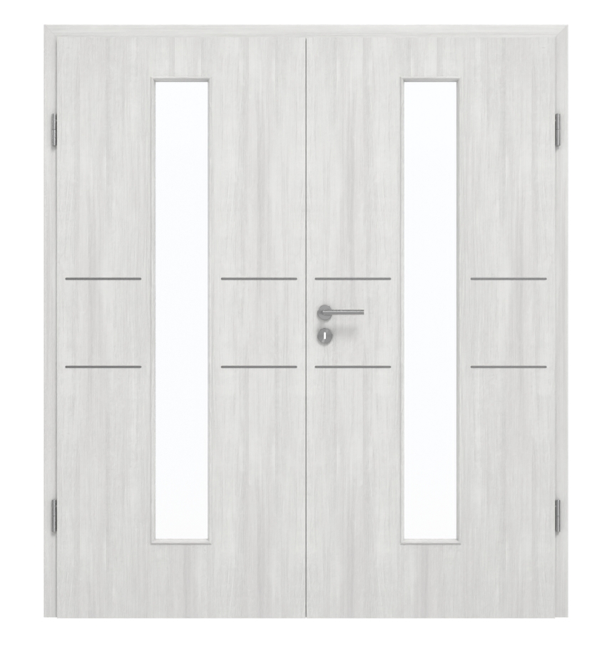 Nowoczesne podwójne drzwi zachwycają łatwą w czyszczeniu powłoką CPL i wąskimi przeszkleniami: