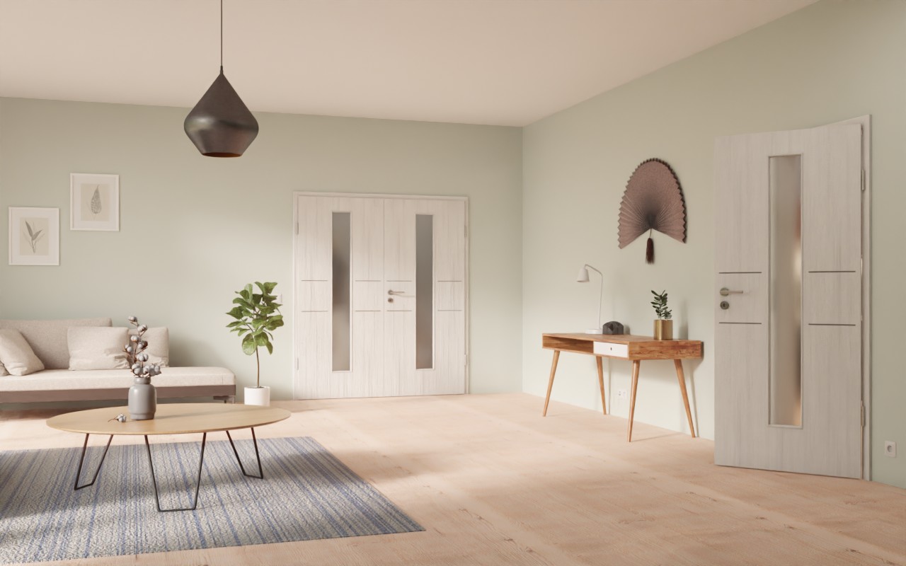 Symetryczny wygląd skrzydeł drzwiowych wynika z umieszczonych pośrodku wycięć na szybę z krótkimi listwami po obu stronach. Od góry do dołu dekor Authentic Grigio pokrywa szary odcień z drobnymi cieniami. Powierzchnia CPL jest łatwa w pielęgnacji, odporna na zabrudzenia oraz uderzenia i zarysowania.