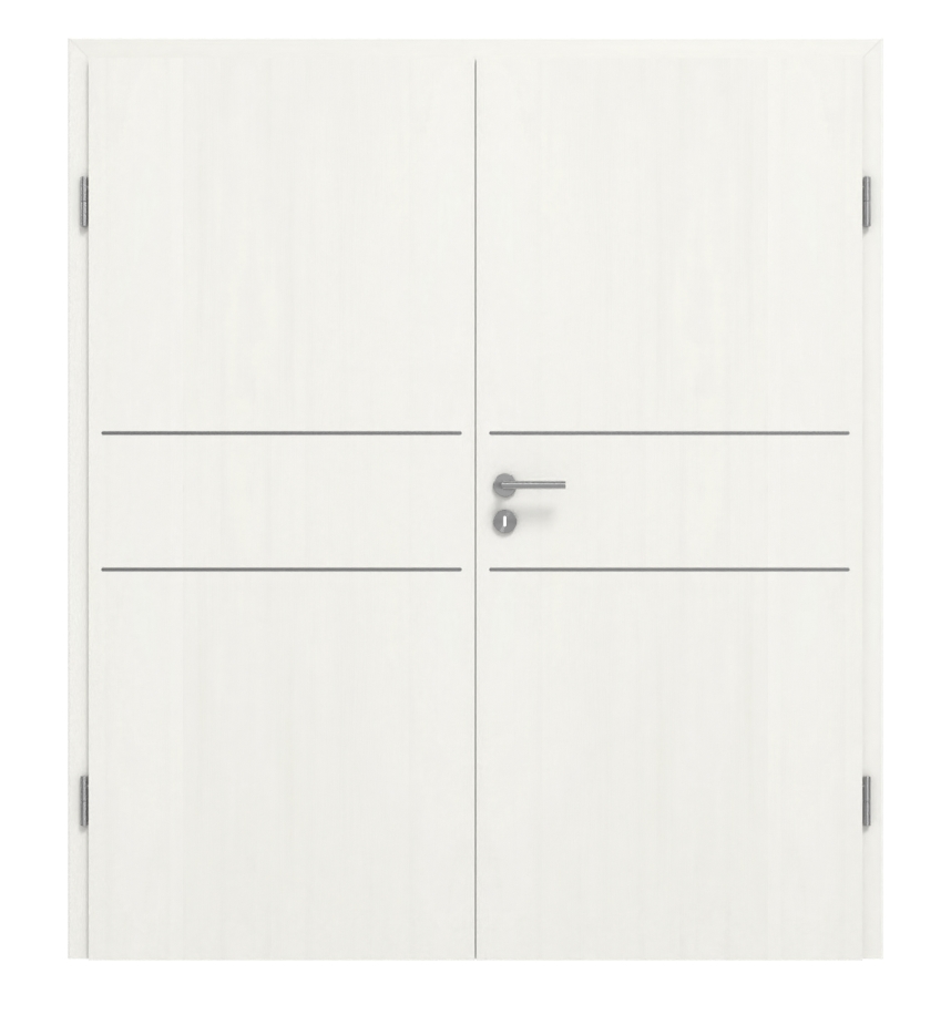 Wysokiej jakości drzwi podwójne wyróżniają się odporną na brud powłoką CPL oraz prostym designem listew: