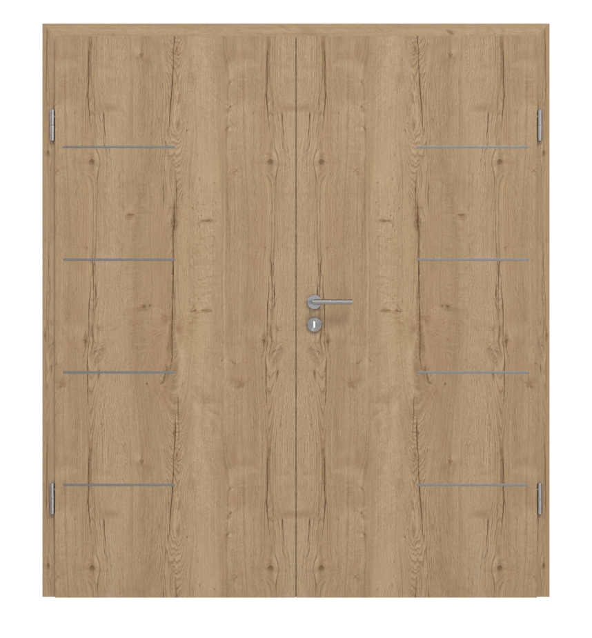 Nowoczesne drzwi podwójne zachwycają wytrzymałą okleiną CPL i eleganckimi listwami: