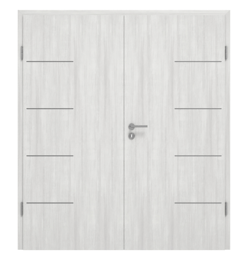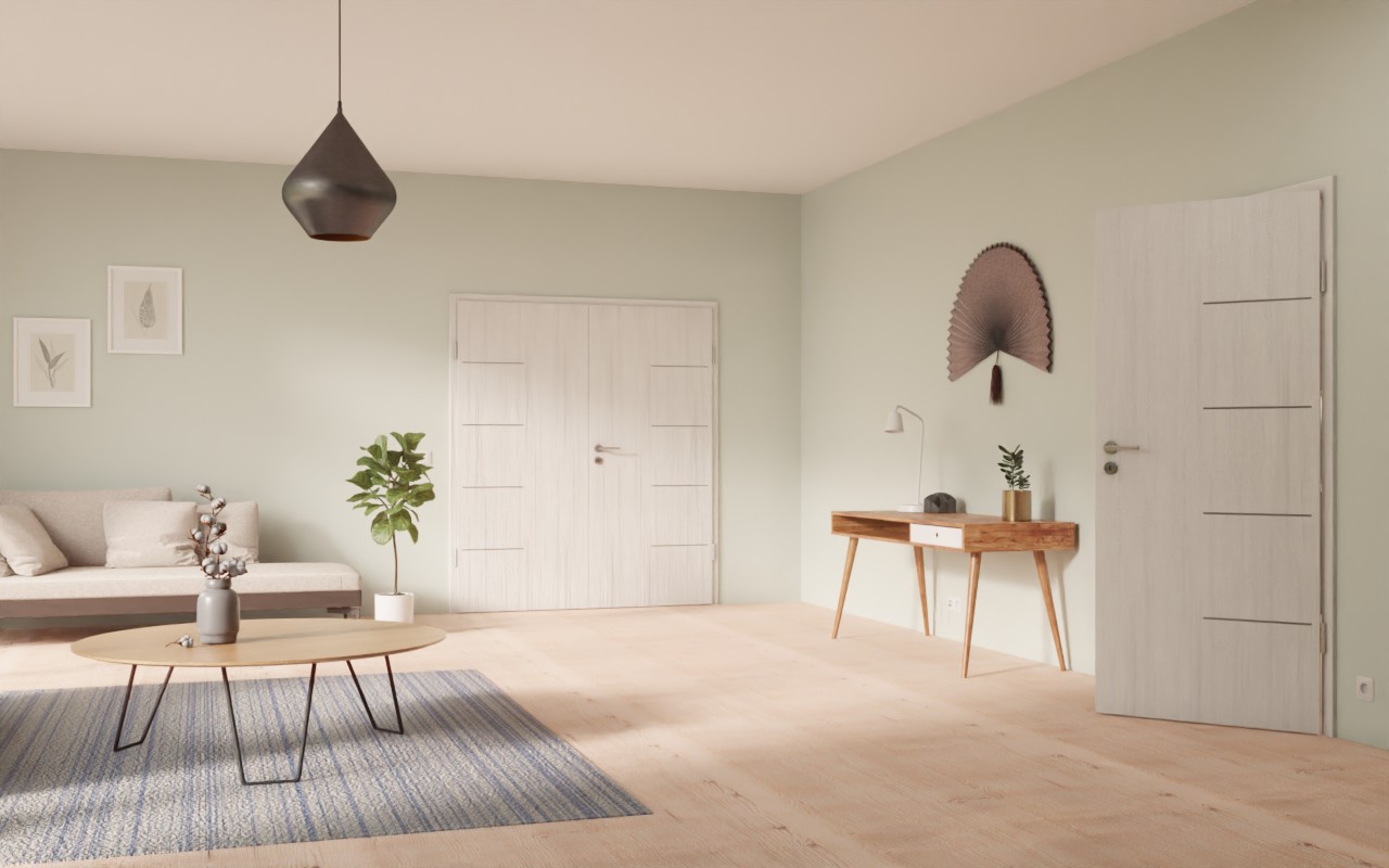 Drzwi wewnętrzne z podwójnymi skrzydłami zachwycają odporną na uderzenia i zarysowania powłoką CPL oraz rdzeniem z wiórów drzewnych: