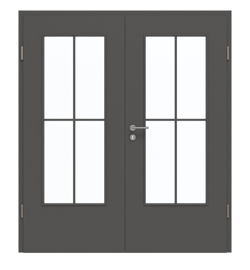 Proste ramy z poprzeczkami dzielą przeszklenia na cztery równe części. Dzięki wykończeniu CePaL Ebony skrzydło drzwi zyskuje nowoczesny charakter i wyraźną kolorystykę w odcieniu antracytu. Oprócz atrakcyjnego wykończenia wizualnego laminat charakteryzuje się wysoką odpornością na obciążenia mechaniczne.