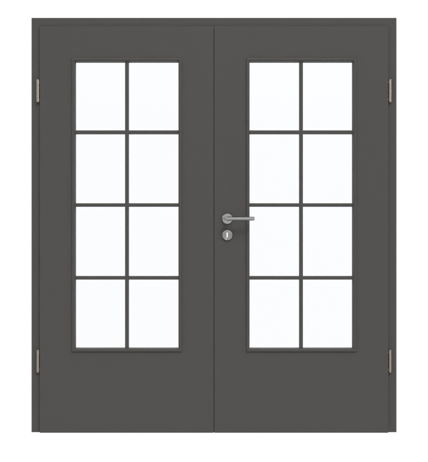 Szklany wycięty fragment zajmuje większość powierzchni każdego skrzydła drzwiowego i zapewnia pomieszczeniu dodatkową jasność. Osiem pól powstaje dzięki zamontowanej ramie szprosowej. Powierzchnia CePaL Ebony nadaje skrzydłu drzwiowemu nowoczesny wygląd dzięki jednolitemu i intensywnemu odcieniowi antracytu. Ponadto łatwa w pielęgnacji laminowana powierzchnia charakteryzuje się wysoką odpornością na zarysowania i ścieranie.