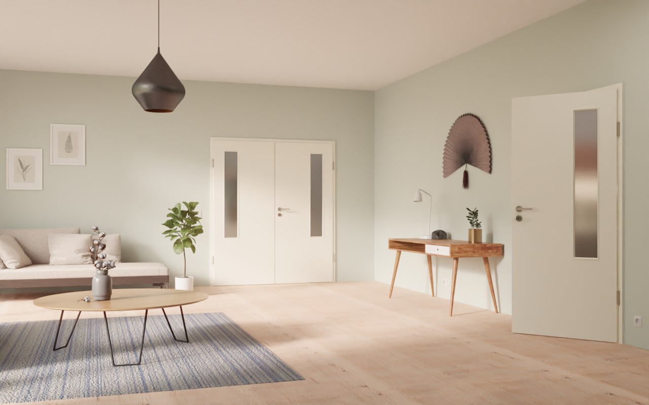 Krótkie, wąskie wycięcia na szybę po stronie zawiasów zapewnia nieco więcej światła w pomieszczeniu. Twój obiekt skorzysta na naturalnym odcieniu powierzchni CePaL Snow White. Łatwy w pielęgnacji laminat jest wyjątkowo odporny na uderzenia i zarysowania.