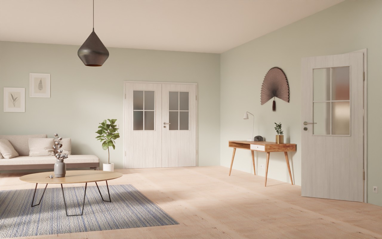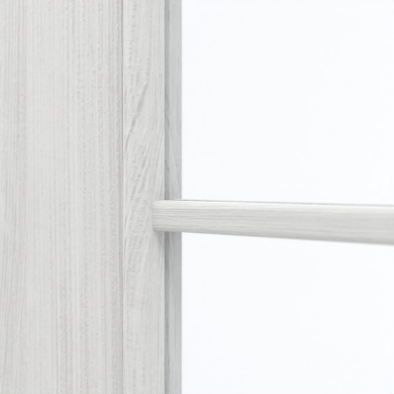 Centralnym punktem jest prostokątny przeszklenie w górnej części drzwi. Delikatne, nałożone listwy nadają mu eleganckie akcenty. Jasny szary z subtelnymi odcieniami rozciąga się wzdłuż skrzydła drzwi. Powierzchnia jest łatwa w pielęgnacji i niezwykle odporna na zarysowania, ścieranie i uderzenia.