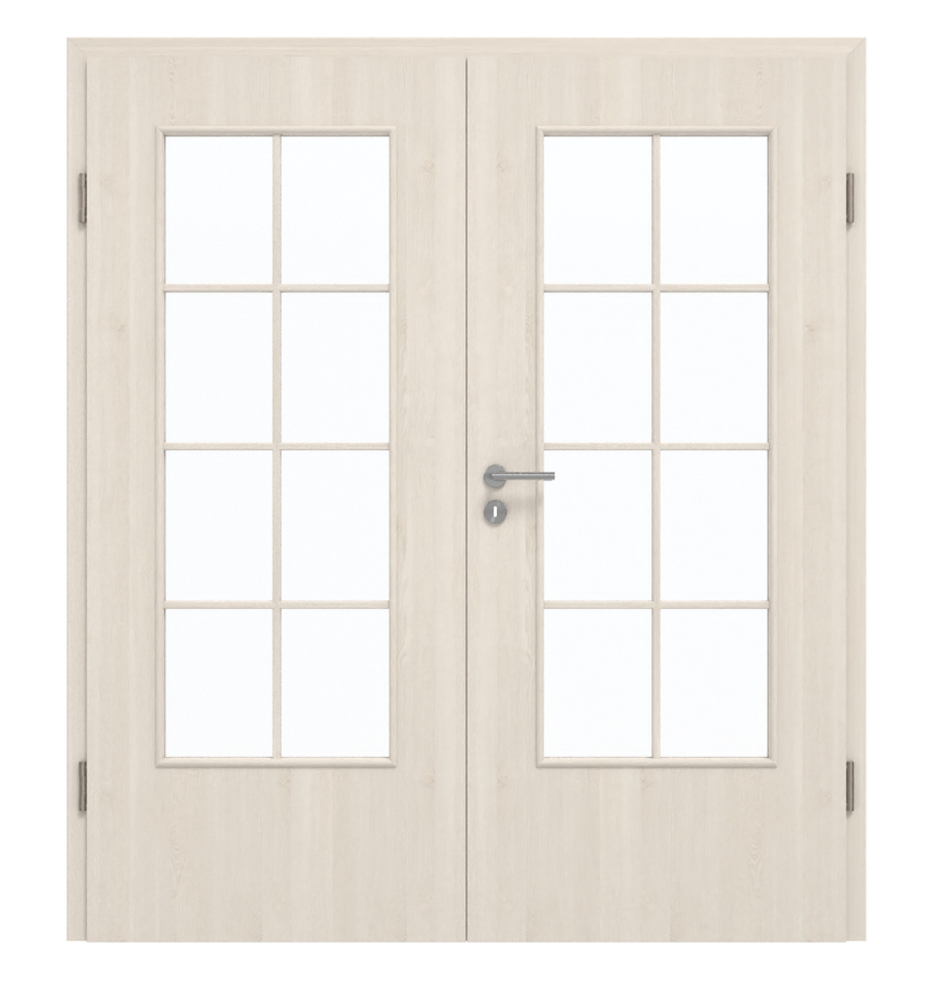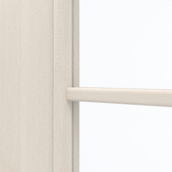 Prostokątne przeszklenia zajmują większość powierzchni skrzydeł drzwi i zapewniają przyjemny dopływ światła. Delikatne, naszywane szprychy nadają konstrukcji piękną symetrię. Autentyczny wygląd drewna uzyskuje się dzięki delikatnym, podłużnym słojom w jasnym, kremowym odcieniu. Uderzenia lub zadrapania nie mają większego wpływu na wytrzymałą warstwę wierzchnią. Ponadto można ją bez trudu wyczyścić.