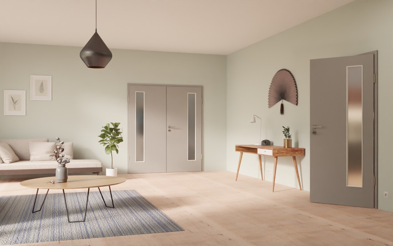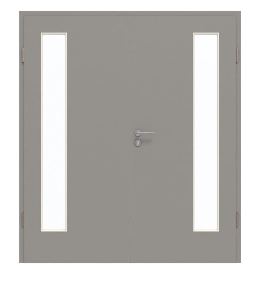 Na skrzydłach drzwi, po stronie zawiasów, znajduje się po jednym wąskim otworze okiennym. Powierzchnię zdobi nowoczesny i jednolity odcień Platingrau . Delikatne ziarno piasku nadaje dekorowi HPL wyjątkową fakturę. Ten dekoracyjny laminat jest odporny na zabrudzenia, zarysowania i uderzenia.