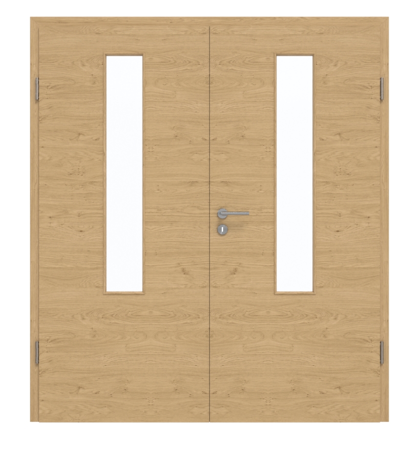 Dzięki rdzeniowi z pełnej płyty wiórowej drzwi dwuskrzydłowe nadają się zarówno do pomieszczeń prywatnych, jak i biurowych. Zostały przetestowane w grupie obciążeniowej M. Oprócz skrzydła ruchomego i skrzydła stałego, zakres dostawy obejmuje również ościeżnicę, zamek i zawiasy.