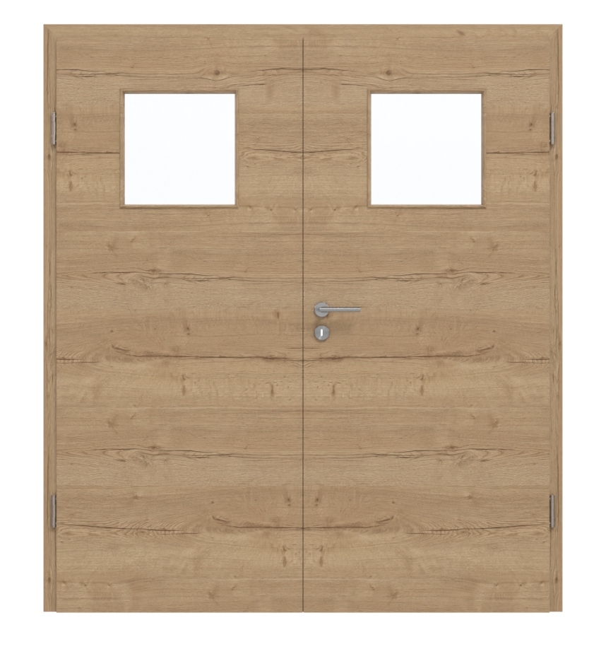 Drzwi podwójne mają rdzeń z pełnego wióru. Są certyfikowane w grupie obciążeniowej M i przeznaczone do użytku w pomieszczeniach prywatnych lub biurowych. Podana cena obejmuje oba skrzydła drzwi, odpowiednią ościeżnicę, zamek wielozadaniowy oraz zawiasy.