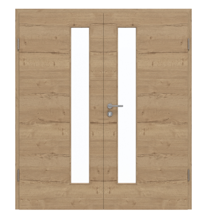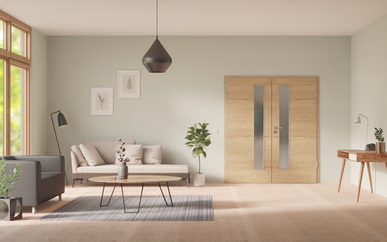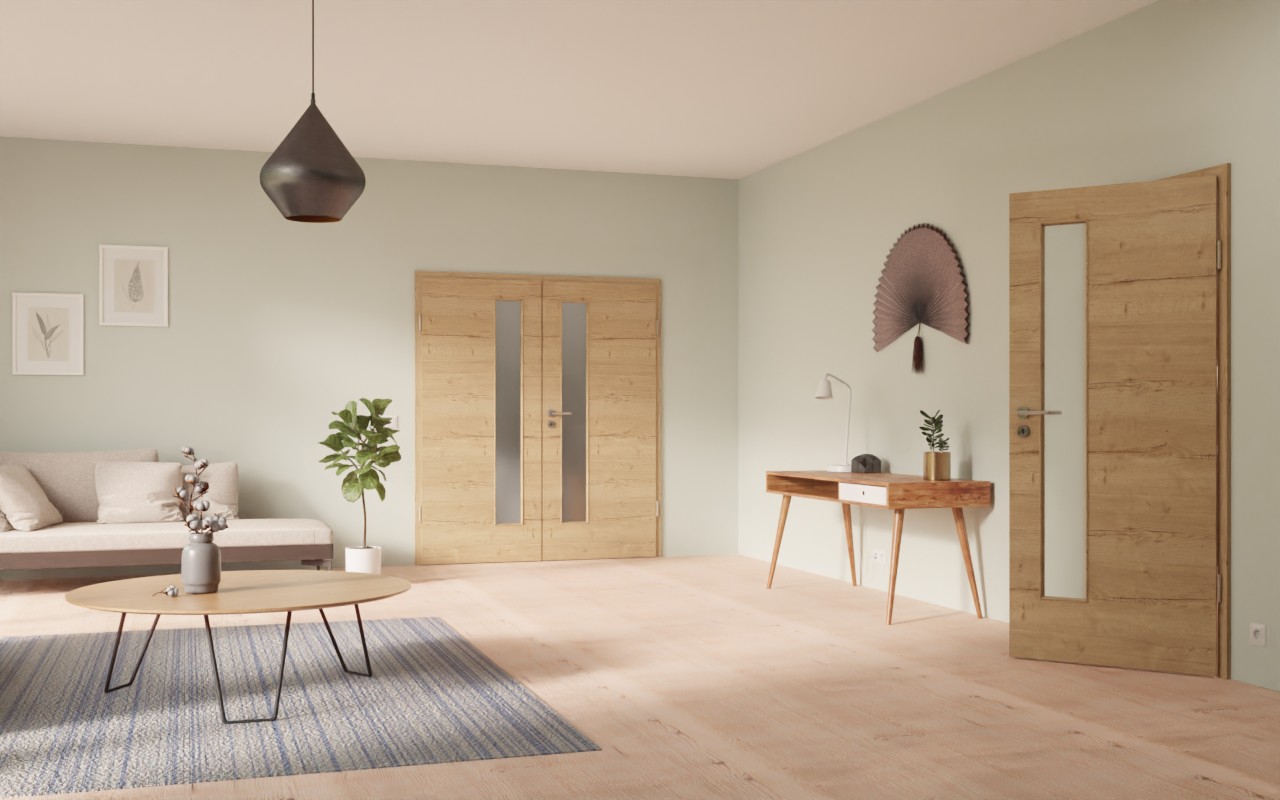 Dwuskrzydłowe drzwi pokojowe są produkowane z rdzeniem z płyty wiórowej pełnej. Dzięki temu spełnia wymagania grupy obciążenia M i może być używany zarówno w pomieszczeniach prywatnych, jak i biurowych. Aby całość była spójna, cena obejmuje oprócz skrzydeł drzwiowych również ościeżnicę, zawiasy i zamek na klucz piórowy.