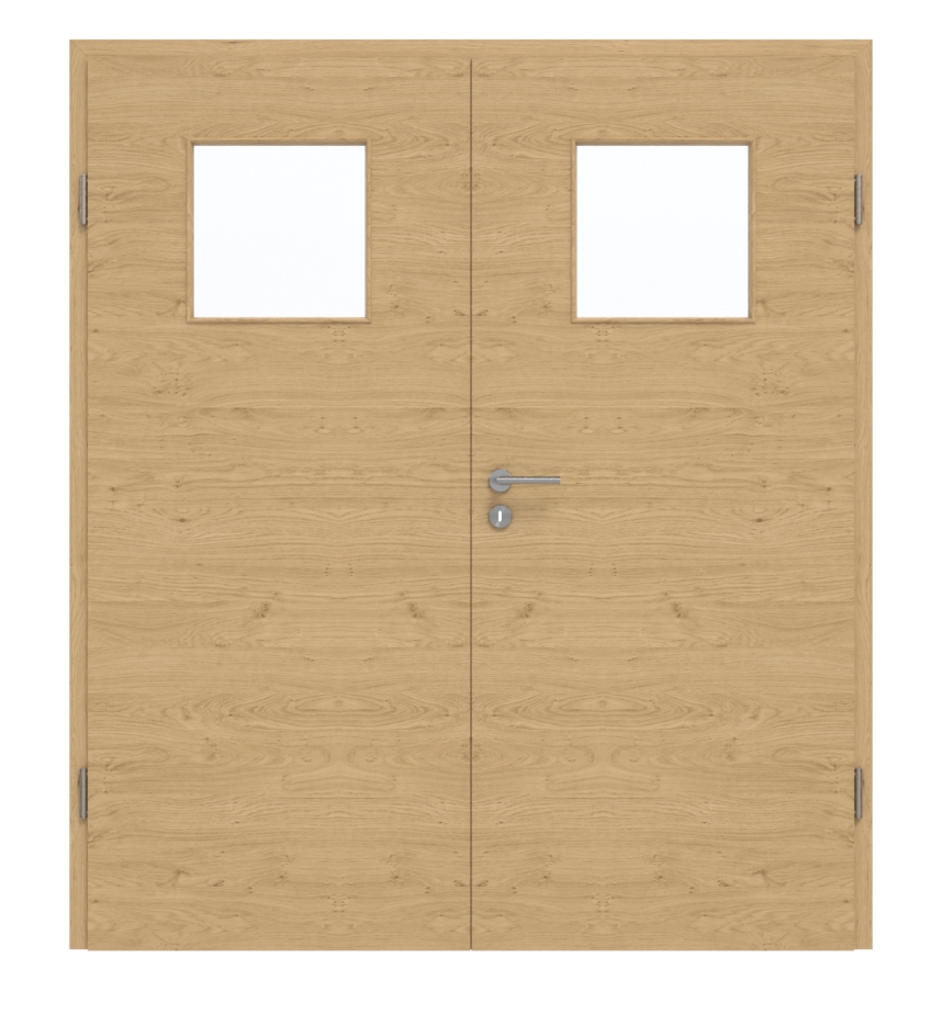 Te dwuskrzydłowe drzwi doskonale nadają się zarówno do pomieszczeń prywatnych, jak i biurowych. Posiadają warstwę środkową z płyty wiórowej i zostały przetestowane w grupie obciążenia M. Cena obejmuje skrzydła ruchome i stałe, ościeżnicę, zawiasy oraz zamek z kluczem.