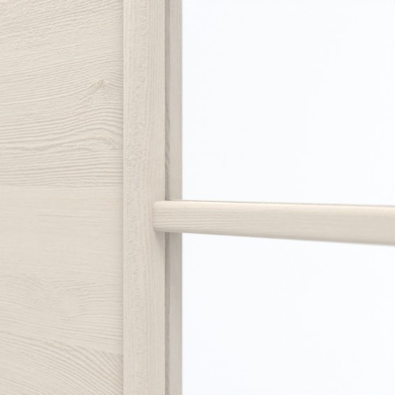 Prostokątne wycięcie na szybę w górnej części drzwi zapewnia piękny dopływ światła. Są one podzielone eleganckimi szprosami, które tworzą nastrojową atmosferę. W dekorze HPL Authentic Perl DQ jasny, kremowy odcień łączy się z poziomym usłojeniem. Powstały wzór drewna sprawia przyjemne, nowoczesne i przyjazne wrażenie. Wytrzymała warstwa wierzchnia jest łatwa w czyszczeniu i odporna na uderzenia i zarysowania.