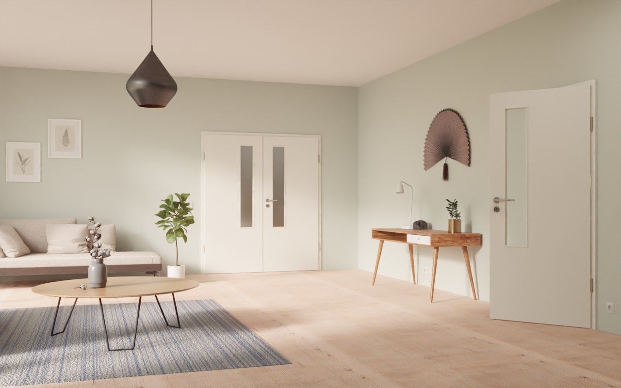 W górnej części skrzydeł drzwiowych po stronie zamka znajduje się krótkie, wąskie wycięcie na szybę, które stanowi ozdobę. Każde nowoczesne wnętrze zyska dzięki biało-szaremu odcieniu Rain, który równomiernie rozkłada się na skrzydle drzwiowym. Warstwa wierzchnia, odpowiednia do codziennego użytku, jest łatwa w pielęgnacji i bardzo wytrzymała.