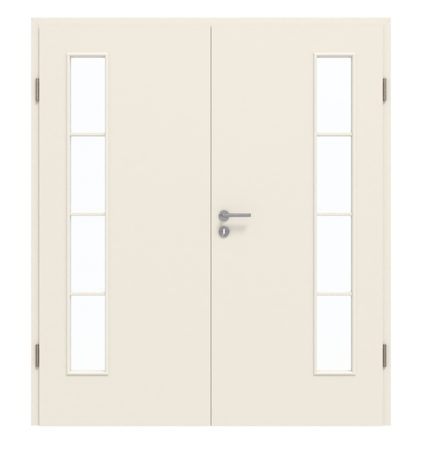 Smukłe ramy szprosowe dzielą długie przeszklenia na cztery identyczne pola. Nowoczesne drzwi pokryte są beżową farbą Dawn. Ponadto warstwa wierzchnia HPL jest łatwa w pielęgnacji oraz odporna na ścieranie i zarysowania.