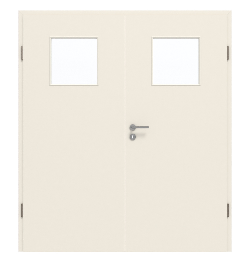 W swej istocie drzwi dwuskrzydłowe wykonane są z pełnej płyty wiórowej. Zostały przetestowana w grupie obciążenia M i może być stosowana w pomieszczeniach prywatnych lub biurowych. Cena obejmuje skrzydła ruchome i stałe, ościeżnicę, zawiasy i zamek na klucz.
