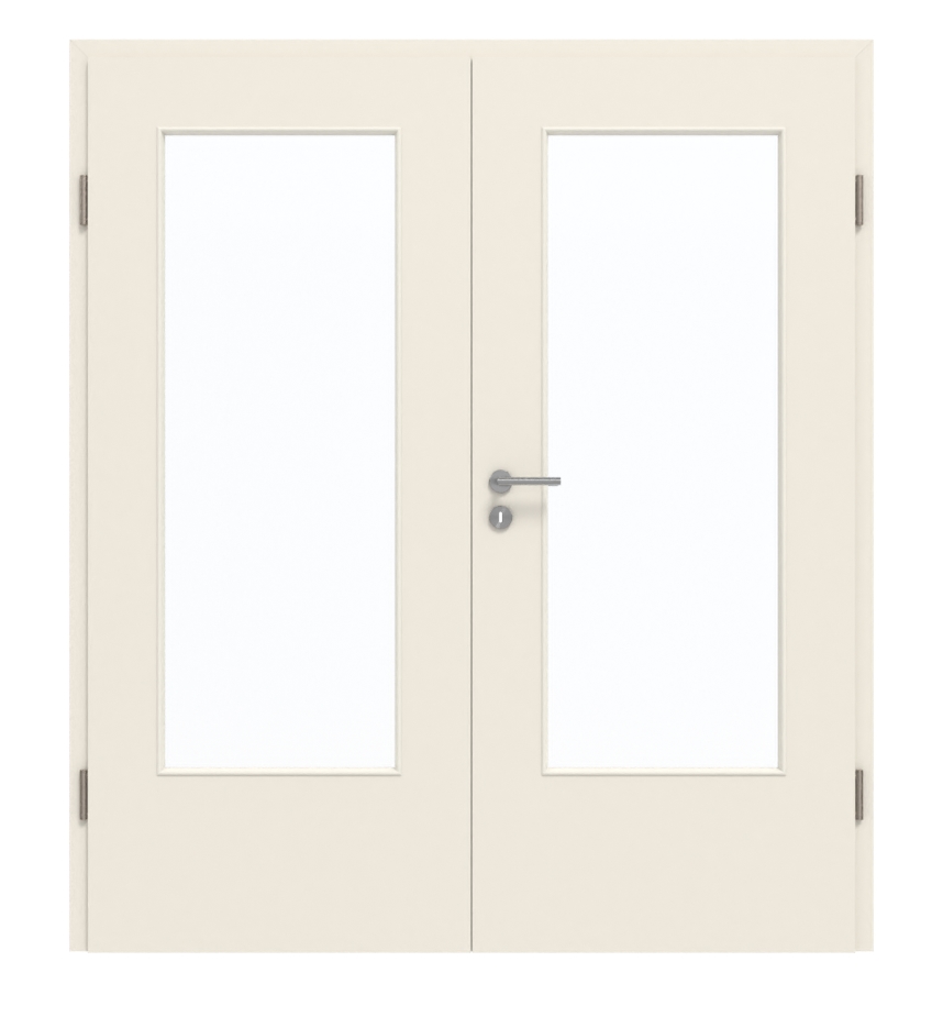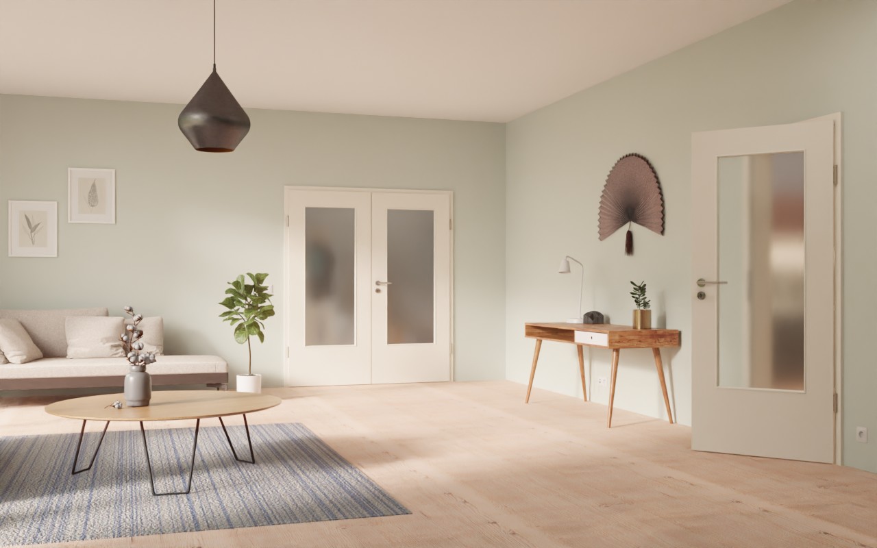 Duże, prostokątne przeszklenia są szczególnie korzystne w ciemnych pomieszczeniach. Gładkie i nowoczesne skrzydło drzwiowe pokryte jest beżową farbą Dawn. Zarysowania i uderzenia nie mają większego wpływu na wytrzymałą warstwę wierzchnią HPL. Ponadto jest ona bardzo łatwa w czyszczeniu.