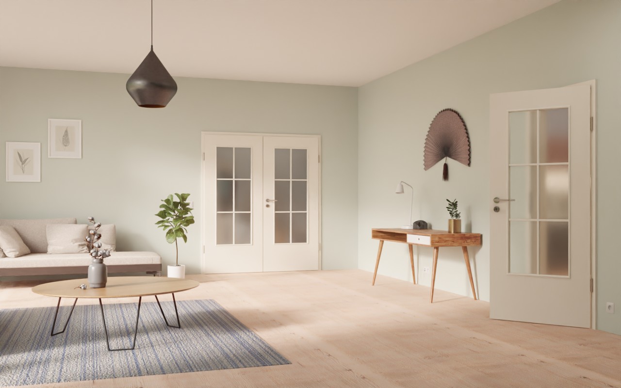Pomieszczenia, które w innym przypadku byłyby ciemne, zyskują dodatkową jasność dzięki dużemu przeszkleniu, przez które wpada światło. Delikatne ramy dzielą szkło na sześć równych części. Beżowy odcień Dawn tworzy jednolitą, gładką powierzchnię na nowoczesnym skrzydle drzwiowym. Ta łatwa w pielęgnacji warstwa wierzchnia wyróżnia się również wysoką odpornością na zarysowania i uderzenia.