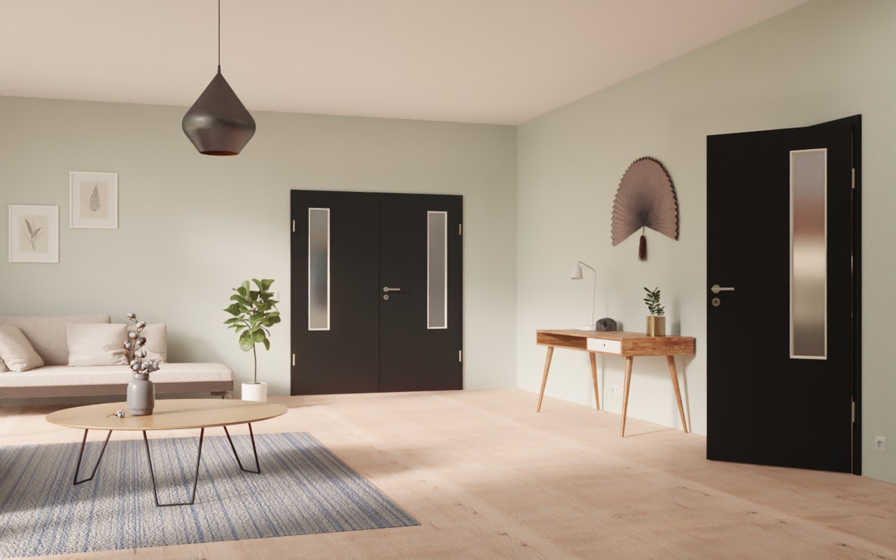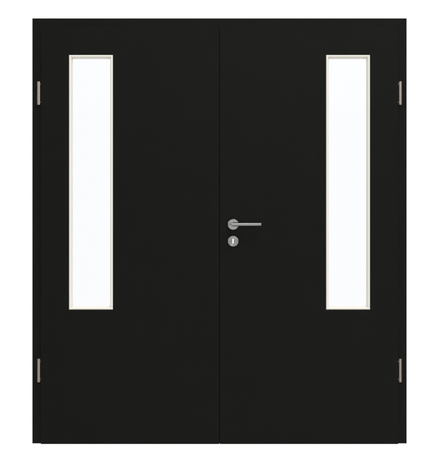 Krótkie, wąskie przeszklenie zdobi skrzydła drzwiowe po stronie zawiasów. Dzięki drobnej, perłowej strukturze czarny dekor HPL Black jest przyjemny w dotyku. Wytrzymała warstwa wierzchnia jest łatwa w czyszczeniu i odporna na ścieranie oraz zarysowania.