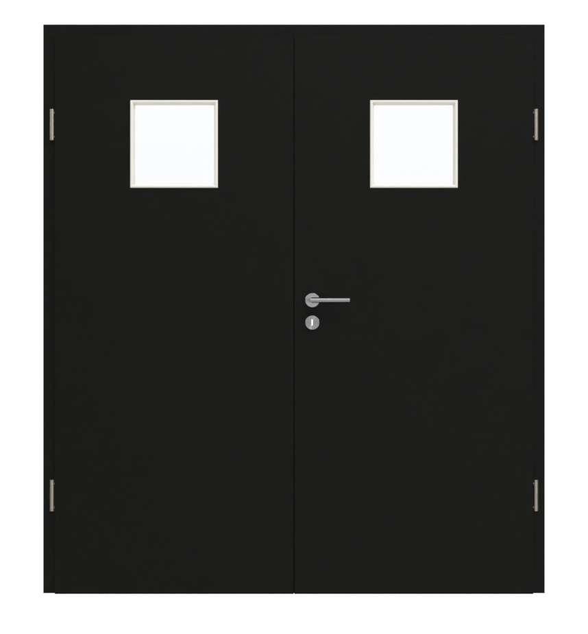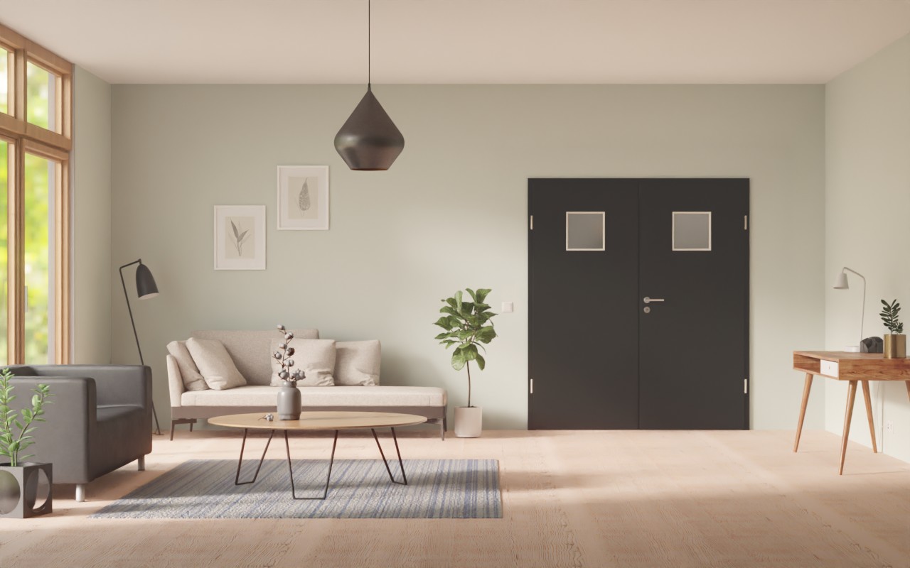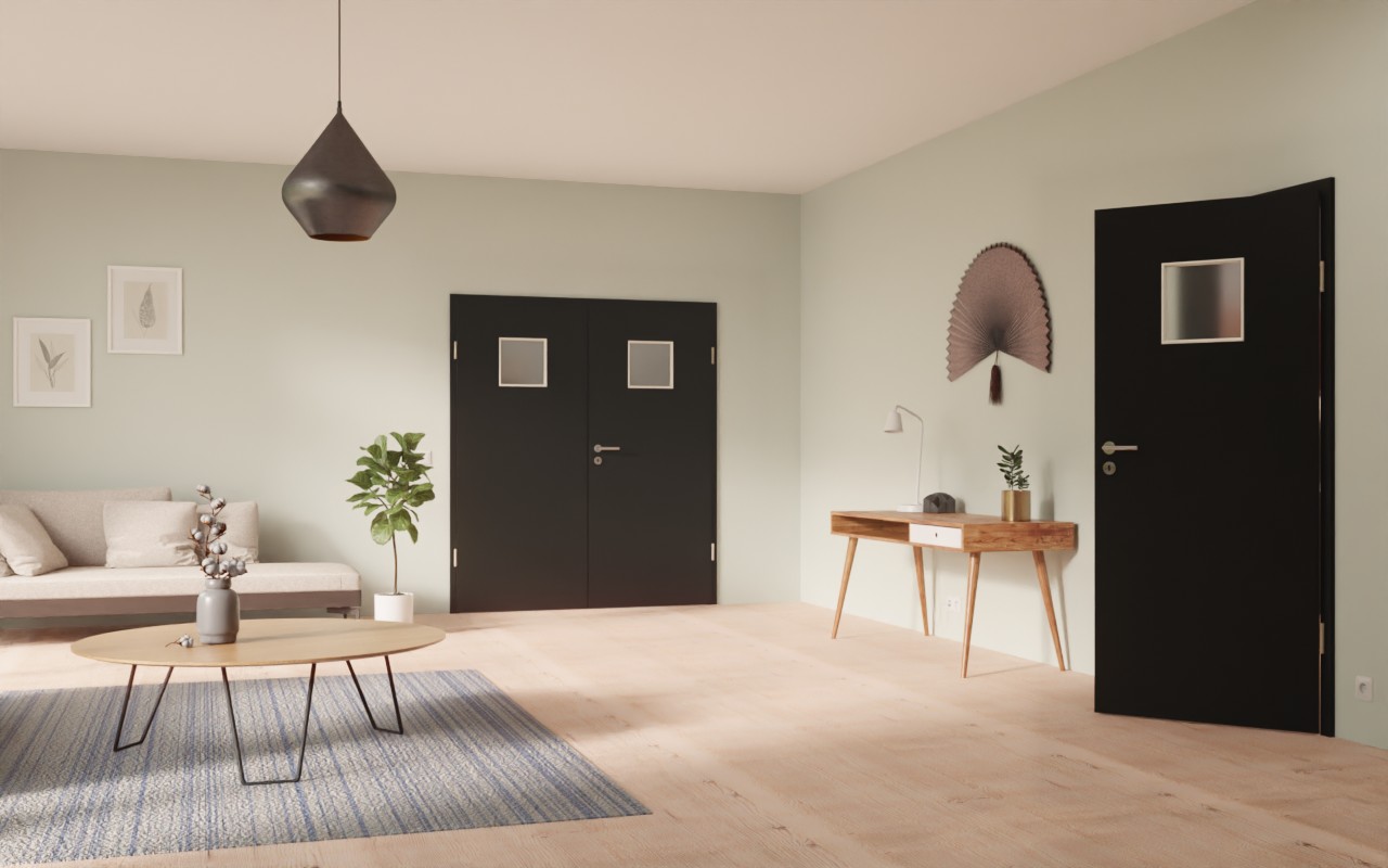 Kwadratowe wycięcie na szybę w górnej części skrzydła drzwiowego pełni funkcję dekoracyjnego elementu stylistycznego. Elegancki czarny dekor Resopal Black doskonale komponuje się z nowoczesnym wystrojem wnętrz. Ponadto warstwa wierzchnia HPL jest łatwa w pielęgnacji oraz odporna na zarysowania, uderzenia i ścieranie.
