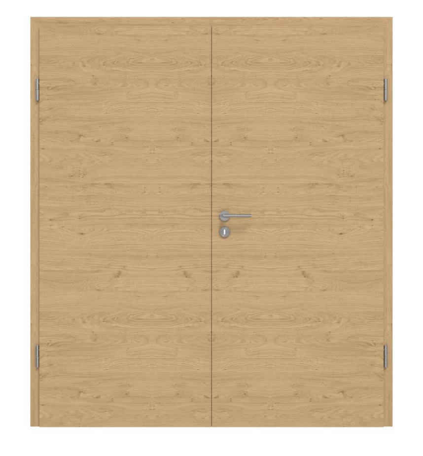 Dzięki klasie wytrzymałości M dwuskrzydłowe drzwi są przeznaczone do użytku w pomieszczeniach prywatnych lub biurowych. O stabilność dba warstwa środkowa, wykonana w zależności od wyboru z płyt wiórowych lub płyt pełnowiórowych. Cena obejmuje skrzydło ruchome i stałe, ościeżnicę, zawiasy i zamek na klucz.
