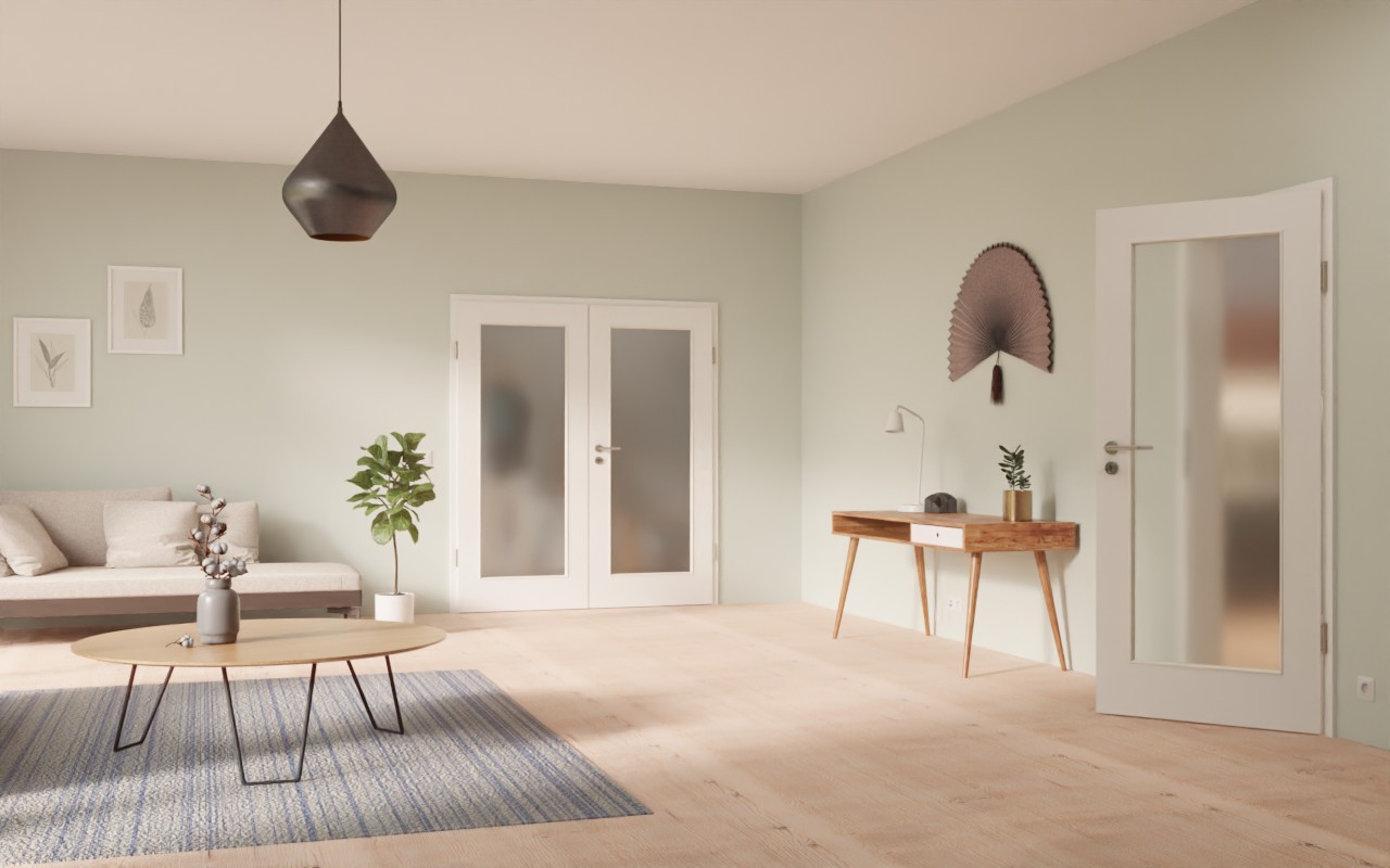 Ciemne pomieszczenia zyskują dodatkowe oświetlenie dzięki dużym przeszkleniom. Jasny Edelweiss oraz jednolite, delikatne ziarno nadają drzwiom wewnętrznym atrakcyjny wygląd. Oprócz atrakcyjnego wyglądu warstwa HPL wyróżnia się również wysoką odpornością na uderzenia, zarysowania i ścieranie. Jest łatwa w czyszczeniu i odporna na zabrudzenia.