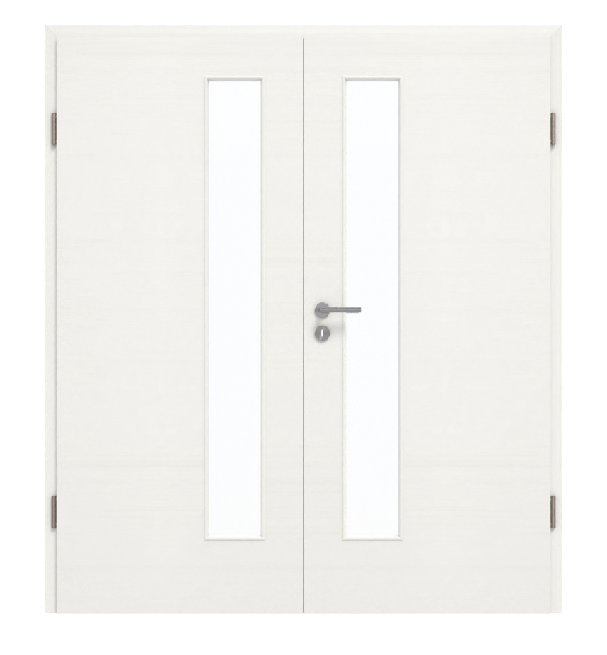 Wzdłuż długości skrzydeł drzwiowych, po stronie zamka, znajduje się wąskie wycięcie na szybę. Model charakteryzuje się łagodnym, naturalnym usłojeniem i białą barwą. Ponadto warstwa wierzchnia HPL jest łatwa w pielęgnacji oraz odporna na zarysowania, ścieranie i uderzenia.