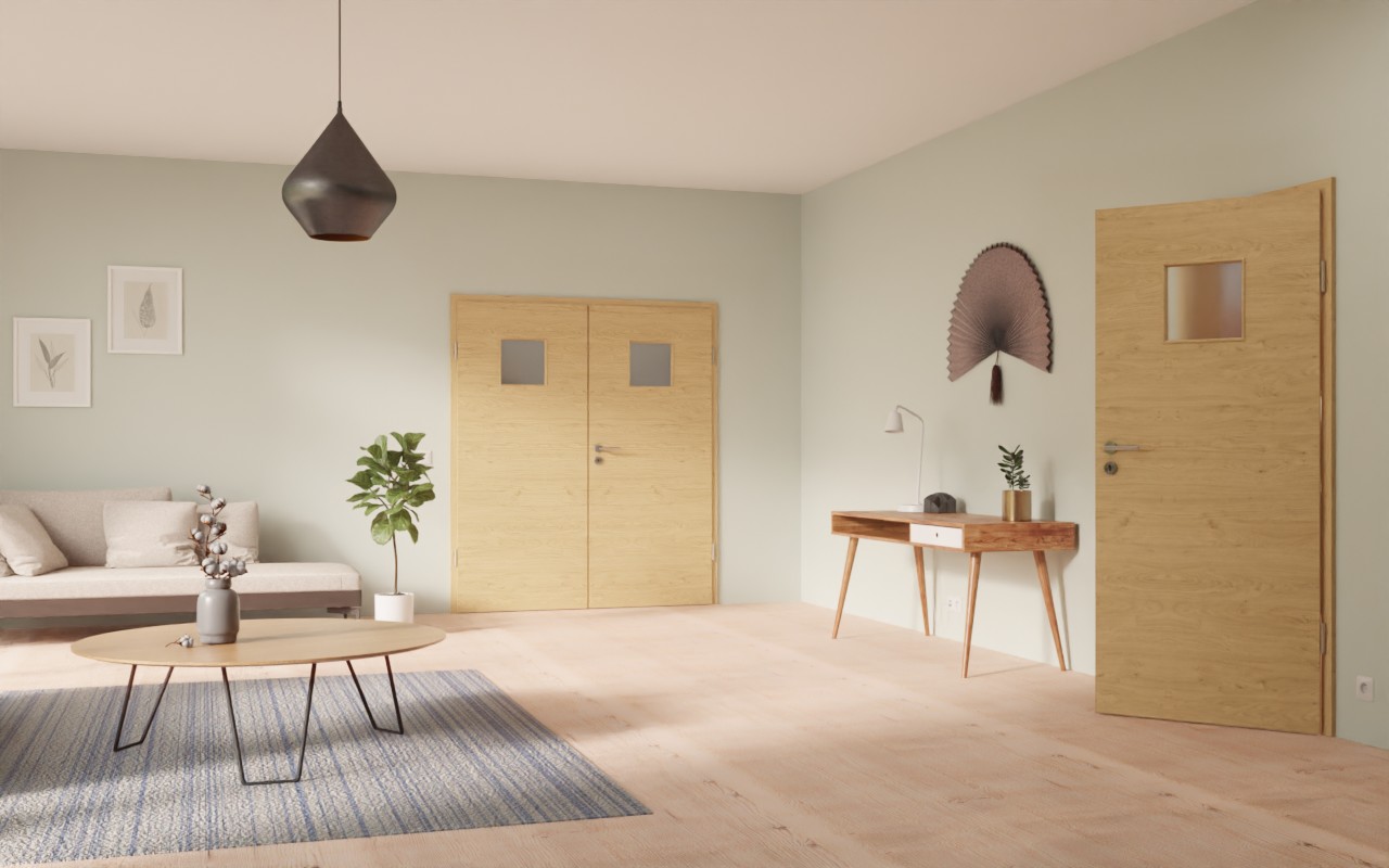 Kwadratowe wycięcie na szybę w górnej części drzwi zapewnia nieco więcej światła w pomieszczeniu. Usłojenia i cieniowania przebiegają w poprzek dekoru drewna HPL authentic dąb sękaty DQ, nadając mu naturalny wygląd. Materiał laminowany wyróżnia się ponadto wysoką odpornością na obciążenia mechaniczne oraz łatwością pielęgnacji w codziennym użytkowaniu.